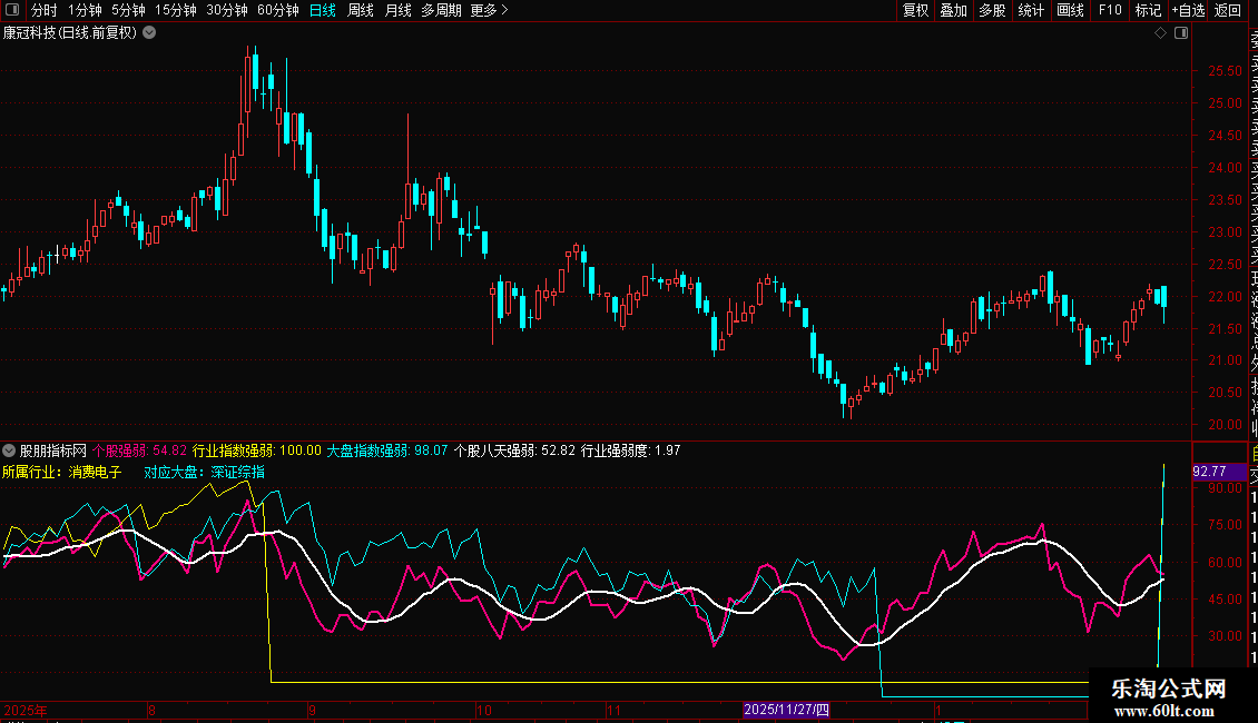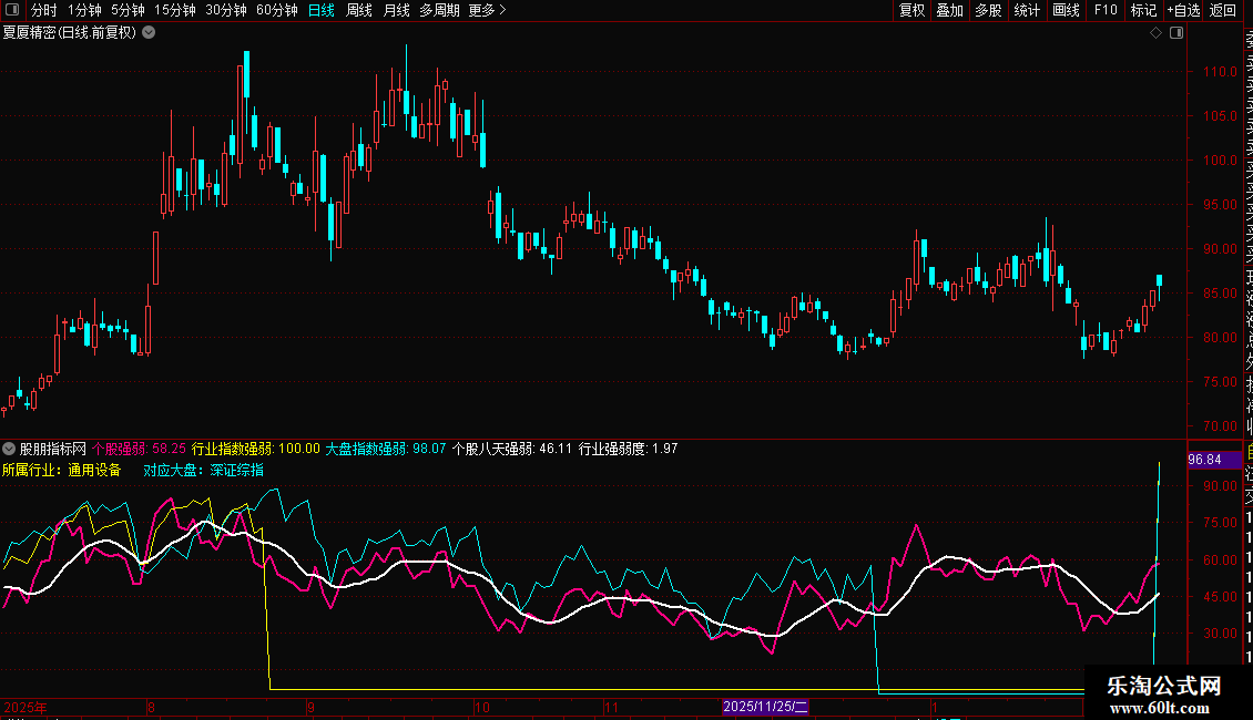 在一个副图中同时显示大盘(青色)、行业(黄色)、个股(洋红)、以及个股均线(白色)四条线。便于日常观察个股走势的强弱。