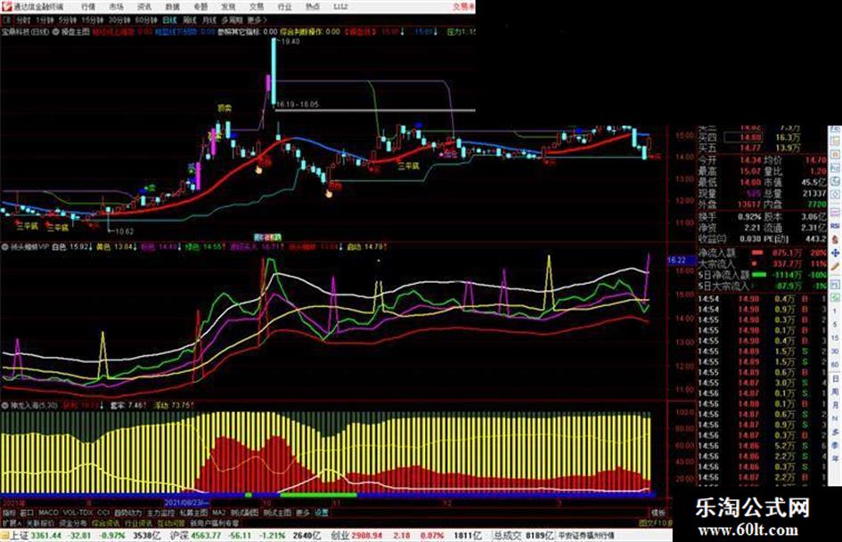 波段买入:IF(CROSS(绿色,粉色),白色*1.05,粉色),,COLORFF00FF,LINETHICK2;