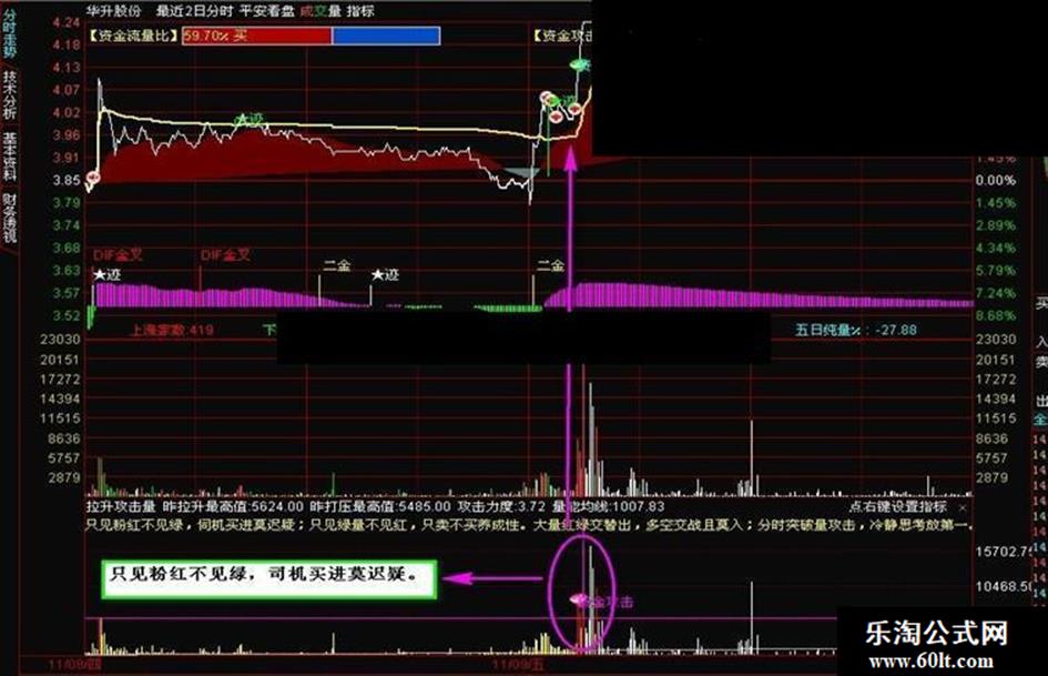 特点:本指标的特点是,区别于普通分时量的白,绿,红三色,用黄色代表成交量,白色为等价量,绿色为超昨日大单打压量,红色为超昨日大单拉升量。