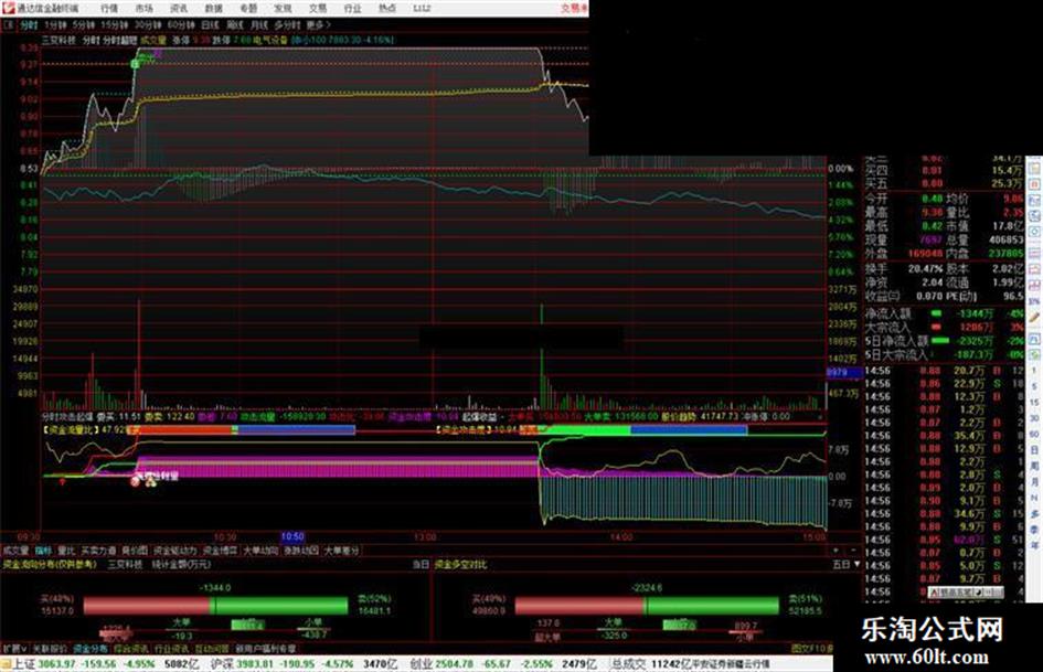 大单卖:(SUM(IF(C<REF(C,1) AND V>4000,V/1000,0),0))*1500,COLORGREEN,LINETHICK3;