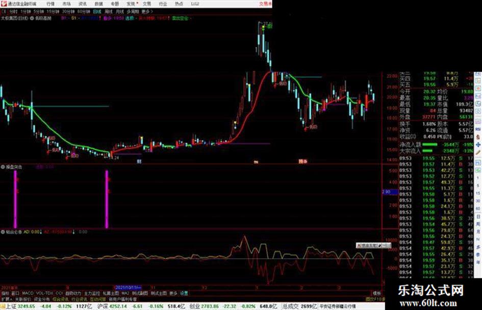 短线:=(CLOSE-MA(CLOSE,13))/MA(CLOSE,13)*20,LINETHICK0,COLORWHITE;中线:=(CLOSE-MA(CLOSE,4))/MA(CLOSE,4)*20,LINETHICK0,COLORYELLOW;VAR200:=(CLOSE-LLV(LOW,20))/(HHV(HIGH,20)-LLV(LOW,20))*100;VAR300:=SMA(SMA(VAR200,3,1),3,1)/28.57;VAR400:=EMA(VAR300,5);操盘:=3*VAR300-2*VAR400;A1:=CROSS(操盘,VAR300) AND VAR300<2.1 AND C>O;STICKLINE(A1,5,0,4,0),COLOR770077;STICKLINE(A1,5,0,3,0),COLOR990099;STICKLINE(A1,5,0,2,0),COLORBB00BB;STICKLINE(A1,5,0,1,0),COLORDD00DD;STICKLINE(A1,5,0,0.3,0),COLORFF00FF;DRAWTEXT(A1,4.2,'突'),COLORRED;DRAWTEXT(A1,3.2,'击'),COLORRED;选股:CROSS(操盘,VAR300) AND VAR300<2.1 AND C>O,COLOR770077;