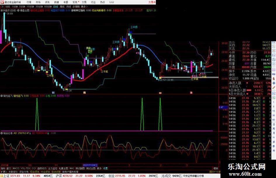 天天利:IF(X_5<=(-0.45) AND X_5>=(-0.48) AND COUNT(X_5<REF(X_5,1),2)=2 OR (X_5<=(-0.48) AND COUNT(X_5<REF(X_5,1),3)=3) AND CLOSE>OPEN AND REF(COUNT(CLOSE<OPEN,2)=2,1) AND MA(VOL,12)<MA(VOL,24),0.5,0),COLORMAGENTA,LINETHICK2;
