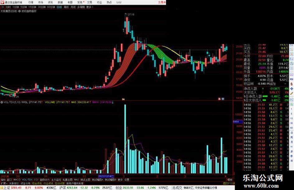 主图有红色粗带和绿色粗带,分别代表趋势走强、趋势走弱