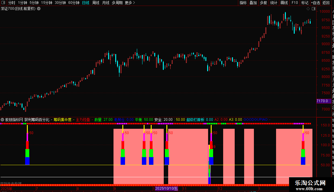 指标会在K线图下方绘制副图,显示“主力控盘”曲线、各类信号柱和“老鼠仓”等信号线。