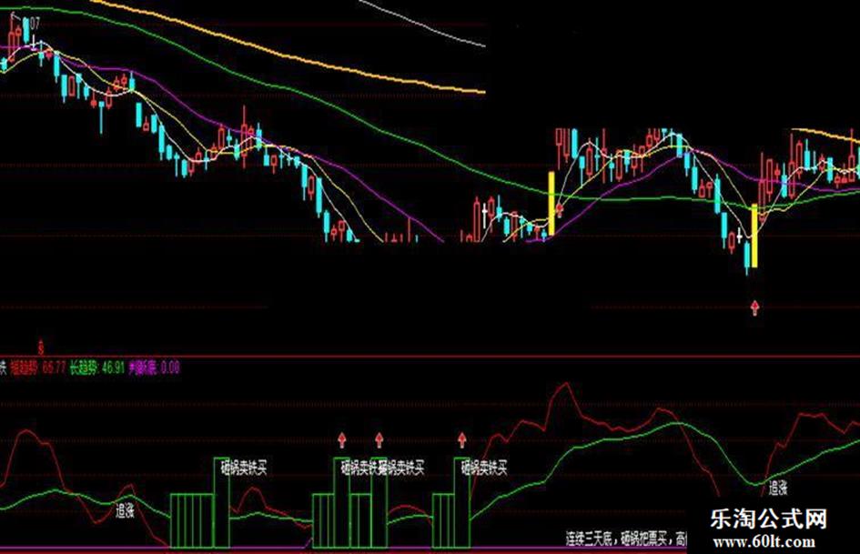 DRAWTEXT(FILTER(长趋势>50,80),10,'连续三天底,砸锅把票买,高位去追涨,小心碰着头');