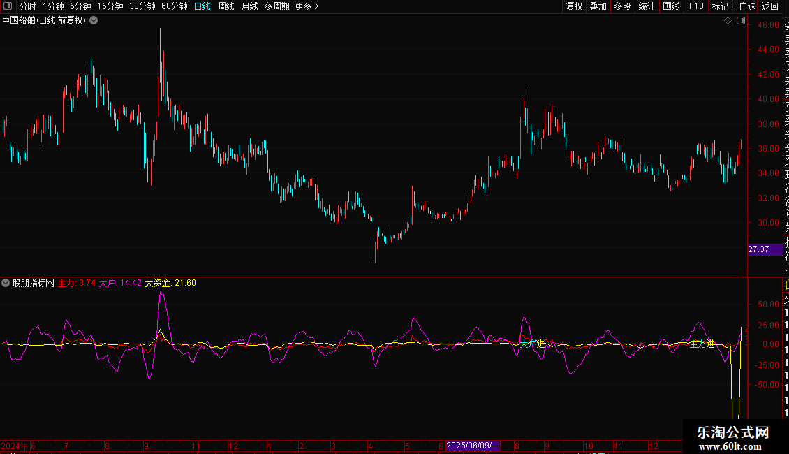 指标还包含“主力进”、“大户进”等文字提示信号,这些信号在特定资金线突破零轴且资金流持续向好时触发,用于捕捉明确的入场时机。