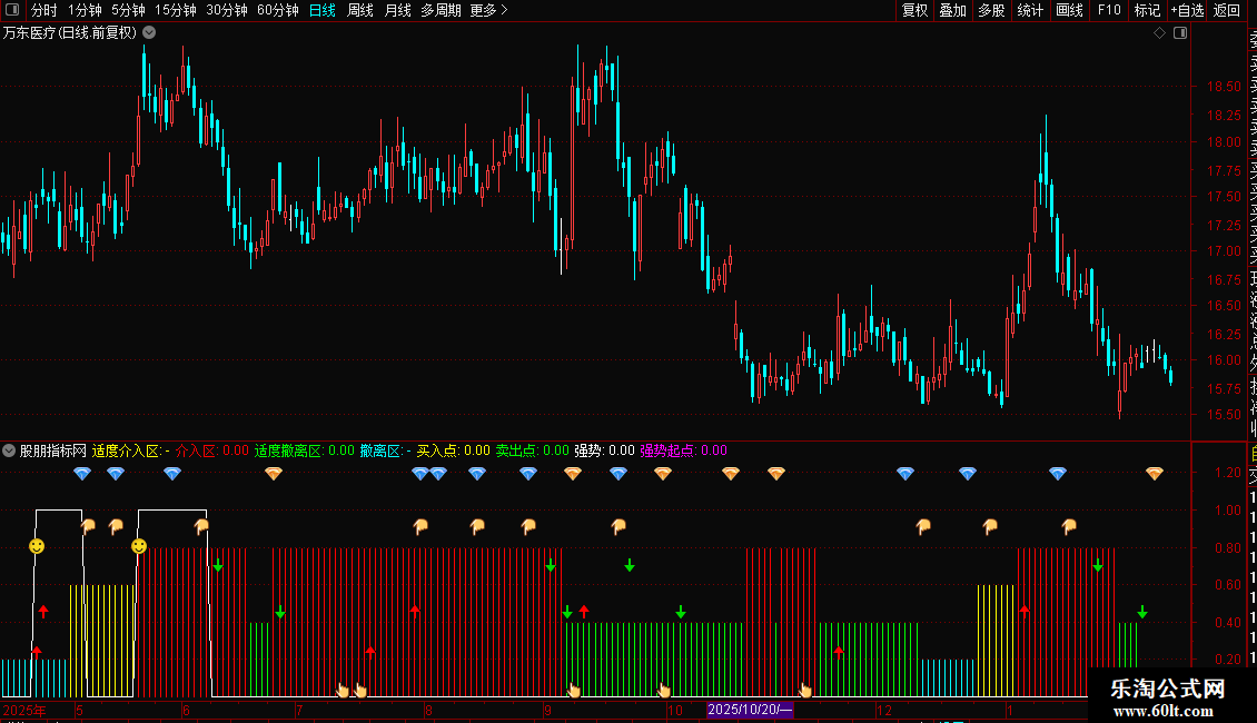 此指标根据大盘强弱走势标示“适度介入区”、“介入区”、“适度撤离区”和“撤离区”,根据个股强弱走势标示“留意”、“买入”和“卖出”点。