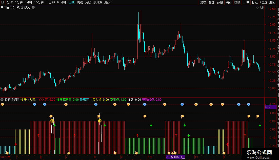 4.买入信号:在个股强弱下行阶段,如涨势、涨幅先后上拐,会出现上指买入信号。如涨幅上穿个股强弱或0轴,会分别出现低位或高位红箭买入信号。