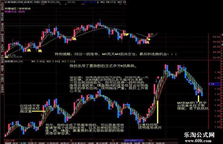 使用中请多注意柱线颜色等变化,比如:M2和M3之间的红柱线与M1与M2之间的黄色柱线叠加,则说明涨势坚决,上档抛压很轻,股价拉高速度快。但下面红柱,上面绿柱意思说上档抛压比较严重,股价上涨很吃力。尤其是在顶部,出现绿色柱线,则说明有大量的股票在抛卖(庄家出货)。