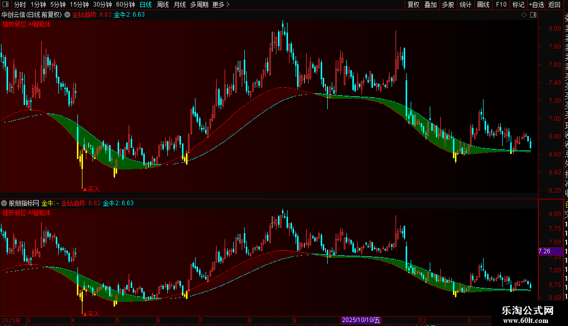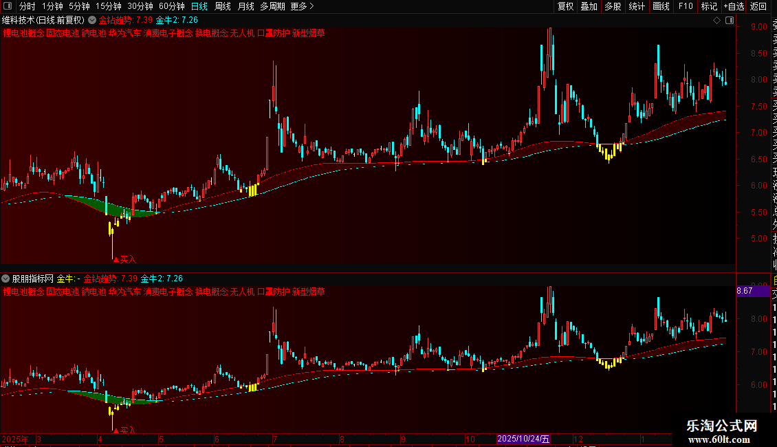 3. 可视化K线修饰:根据股价与“金钻趋势”线的位置关系,对原始的K线进行了颜色和形态的重新绘制,使突破或围绕该线运行的状态一目了然。例如,当股价运行于该线之上时,K线会被渲染为黄色。