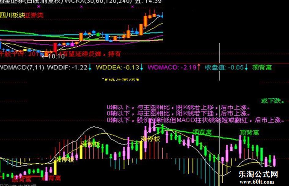 DRAWTEXT(CURRBARSCOUNT=40,WZ*1.10,'0轴以上,与主图相比,阴K线若高收,后市下跌。')COLOR44FF00;