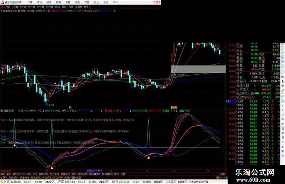 DRAWTEXT_FIX(1,0,0.1,0,'方法1:配合“探底擒妖”副图指标,当某日出现“探底点”信号时,观察当天或后续10日内,是否出现“手指”信号,如有,即可买进;'),COLORGRAY;
