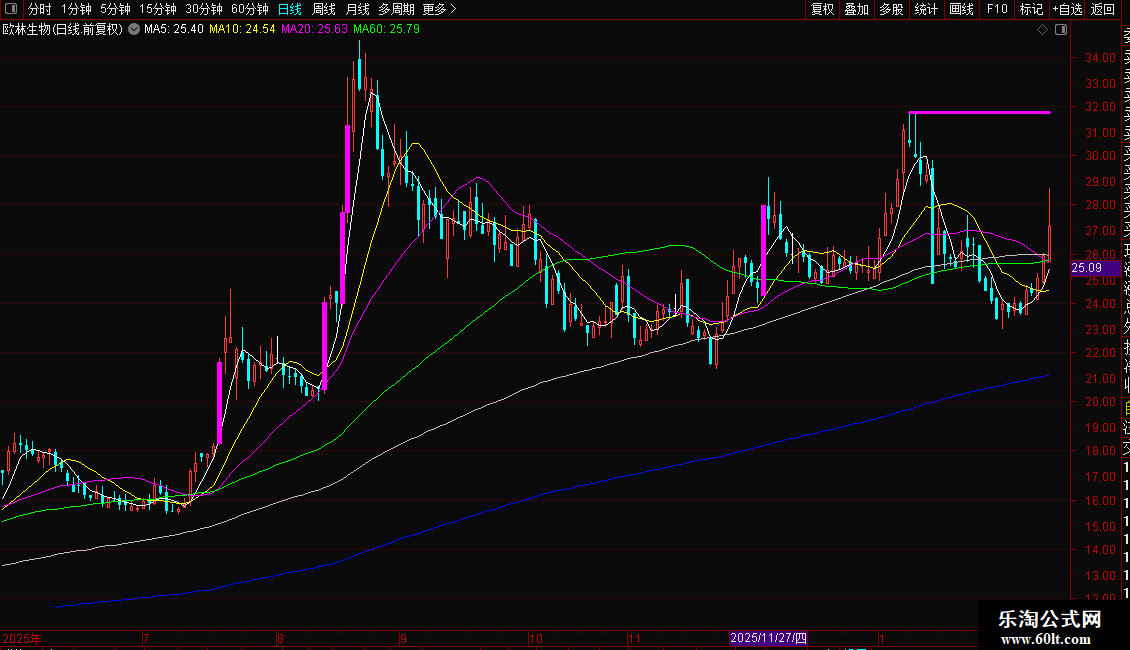 3. 涨停标识:在K线图上用洋红色柱状线醒目地标记出当日涨幅超过9.5%的涨停板。