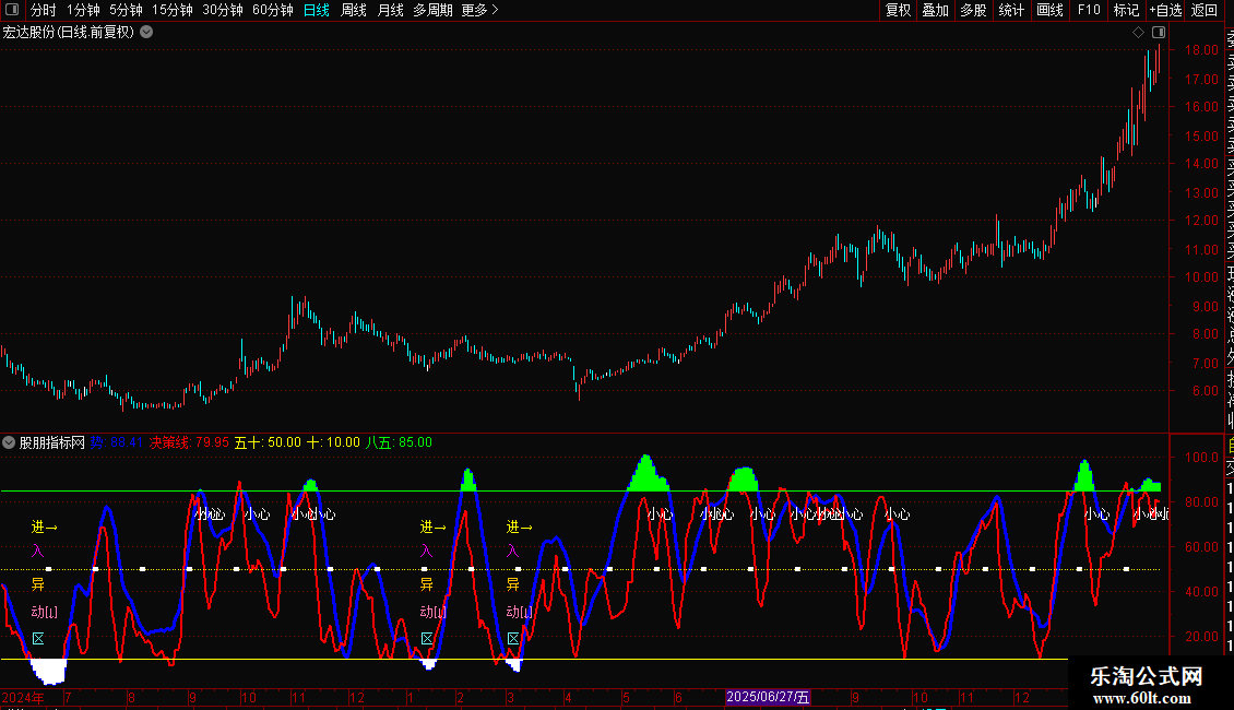DRAWTEXT(CROSS(80,决策线),75,'小心')COLORWHITE;