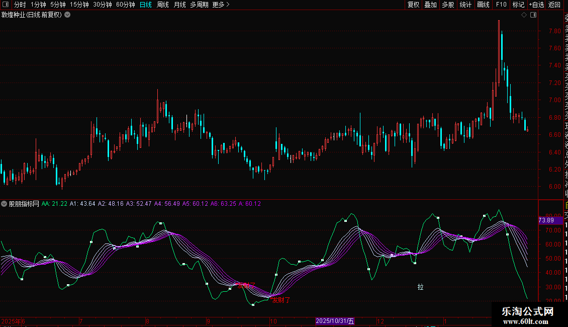DRAWTEXT(CROSS(AA, A5) AND REF(AA,1)<34,REF(AA,1),'*发财了'), COLORRED;