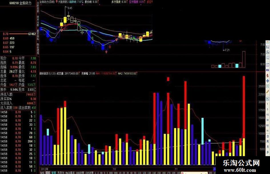 图说明:1.黄色持股,蓝色持币。2.红色B出现买入。3.绿色箭头出现“逃顶”减仓,绿色S出现卖出。主图中加入10日的成交量。