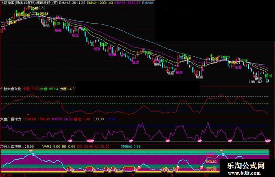 4.巧判大盘顶底(副图):大盘分4个区位,底部介入出出现(红+字)抄底。顶部风险区附近(蓝点)逃命。