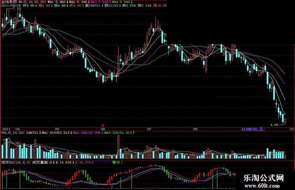 "VOL"调整成交量能图形(高度)与KDJ线的匹配状态。