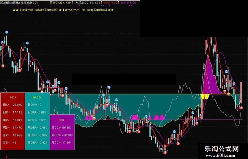 1.指标中,将宝塔线进行简化标识,直接用红绿彩球进行提示,使画面清爽些。