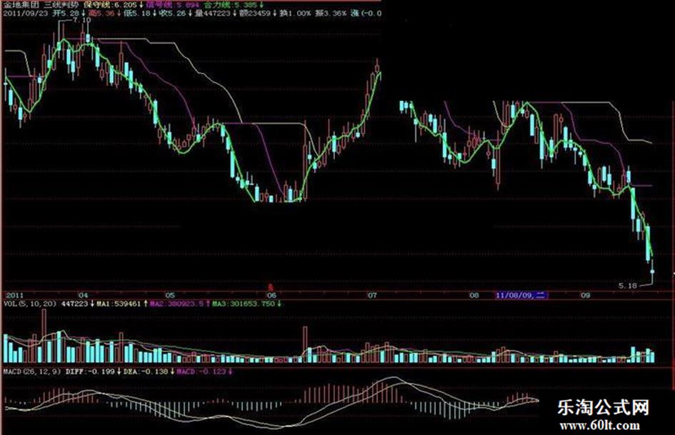 保守线:HHV(FORCAST(C,10),18),coloryellow; 信号线:HHV(FORCAST(C,10),8),colorff00ff; 合力线:FORCAST(C,10),color00ff00,linethick2;