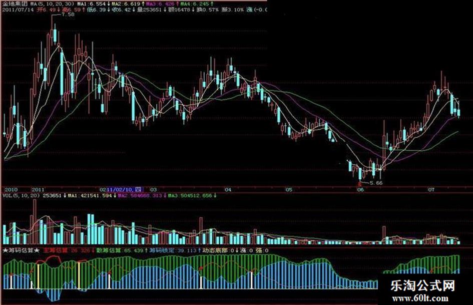 散筹估算:EMA((WINNER(C*1.1)-WINNER(C*0.9))*70,3),LINETHICK1,colorgreen;