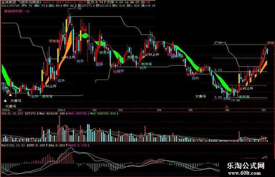 DRAWTEXT(CROSS(趋势线,0)AND 黑马线<40,(HIGH* 0.92),'大黑马'),COLORYELLOW;