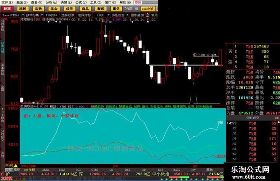 【板块联动----个股板块自适应联动 副图】===[ DZH2版 ]=== 板块联动----个股板块自适应联动公式系副图指标,自动跟踪主图代码,并显示相对应板块的K线或收盘价线,调节“线型切换”钮可使大盘、所属板块和主图个股实现收盘价3线同图,并可进行个股在所属板块中的领涨分析. 公式加密无时限.板块联动助你在翻阅个股的同时及时发现走强板块. 图例: