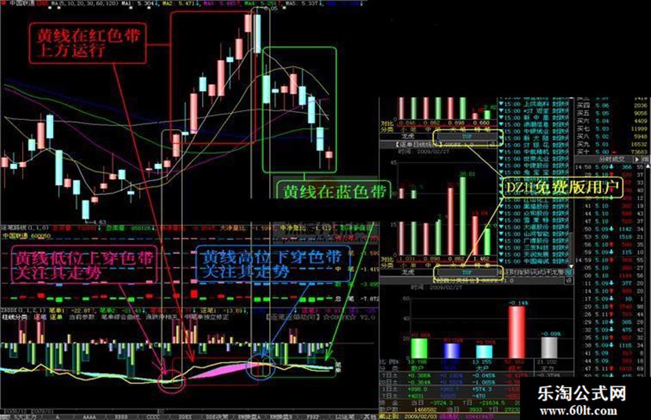 1:红色带表示上涨趋势,绿色带表示下跌趋势,黄线指示可操作程度;