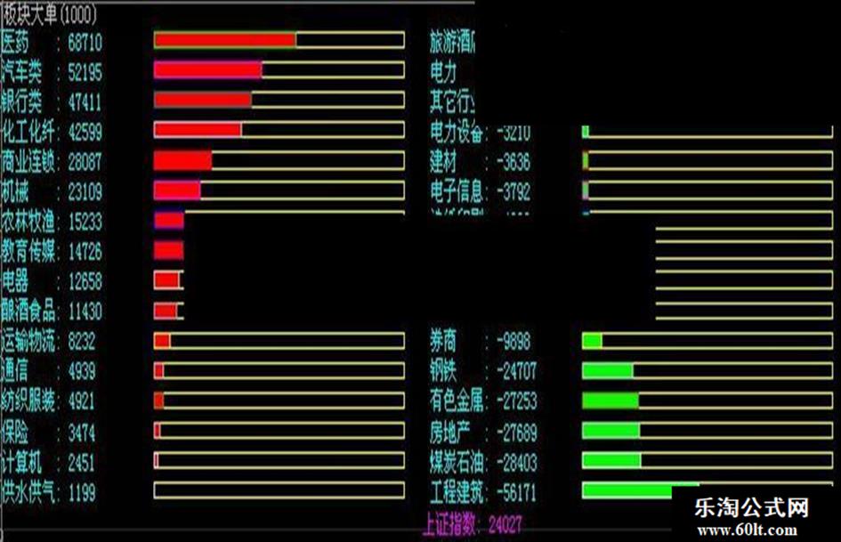 上篇帖子中的加工数据是涨幅,这篇帖子中的加工数据是DZH的大单(含特大)(好像号称主力资金嘛)。。。 本人对DZH的大单定义实在不敢苟同,至少我认为还要考虑以下三方面的因素: 1、流通盘大小; 2、当前股价位置; 3、当前股性活跃度; 呵呵,本人没有能力自己去定义,也只好拿那DZH的东西咔嚓咔嚓做下加工了。。。 还是那句话:指标加密不限时,喜欢的下着玩玩,不喜欢的一笑而过。。。 ①当日板块大单(日线、L2)