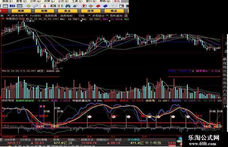 VAR2:=REF(LOW,1); VAR3:=SMA(ABS(LOW-VAR2),3,1)/SMA(MAX(LOW-VAR2,0),3,1)*100; VAR4:=EMA(IF(CLOSE*1.3,VAR3*10,VAR3/10),3); VAR5:=LLV(LOW,30); VAR6:=HHV(VAR4,30); VAR7:=IF(MA(CLOSE,58),1,0); VAR8:=EMA(IF(LOW<=VAR5,(VAR4+VAR6*2)/2,0),3)/618*VAR7; VAR9:=IF(VAR8>100,100,VAR8); STICKLINE(VAR9>-150,0,VAR9,0.3,0), COLORFF00FF; 底部吸筹指标:(CLOSE-MA(CLOSE,40))/MA(CLOSE,40)*100,COLOR00FF00; STICKLINE(CROSS(底部吸筹指标,-24),100,0,1,0), COLORFFFFFF; 先知: (CLOSE-MA(CLOSE,5))/MA(CLOSE,5)*100, COLORFF00FF; 可能放量拉升:IF(CROSS(底部吸筹指标,-24),1,0), COLORFFFFFF; 短线获利:STICKLINE(REF("KDJ.J",1)<0 AND "KDJ.J">0,60,0,2,0),COLOR0000FF; VARK1:=(CLOSE-LLV(LOW,27))/(HHV(HIGH,27)-LLV(LOW,27))*100; VARK2:=REVERSE(VARK1); VARK3:=SMA(VARK1,3,1); 波段王:SMA(VARK3,3,1), COLORRED,LINETHICK2; 波段鬼:SMA(波段王,2.5,1),COLORYELLOW,LINETHICK2; 趋势线: 3*SMA((CLOSE-LLV(LOW,27))/(HHV(HIGH,27)-LLV(LOW,27))*100,5,1)-2*SMA(SMA((CLOSE-LLV(LOW,27))/(HHV(HIGH,27)-LLV(LOW,27))*100,5,1),3,1),COLORFF6666,LINETHICK2; RSV9:=(CLOSE-LLV(LOW,9))/(HHV(HIGH,9)-LLV(LOW,9))*100; K1:SMA(RSV9,3,1); DK1:K1-REF(K1,1),COLORSTICK; 出手就赢:IF(DK1>7 AND REF(DK1,1)<0 AND (DK1-REF(DK1,1))>9,50,0), STICK,COLORYELLOW;DRAWICON(出手就赢>0,50 ,1); STICKLINE( CROSS(趋势线,10),0,73,3,0), COLOR3366FF; DRAWTEXT(IF(CROSS(趋势线,10),100,0),68,'抄底'),COLORWHITE ; DRAWTEXT(IF(CROSS(10,趋势线),1,0), 10,'$备钱'),COLOR33FFCC; DRAWTEXT(REF("KDJ.J",1)<0 AND "KDJ.J">0,50,'短买'),COLORRED ; DRAWTEXT(CROSS(底部吸筹指标,-24),80,'抄底'),COLORWHITE ; RSV:=(((CLOSE - LLV(LOW,9)) / (HHV(HIGH,9) - LLV(LOW,9))) * 100); 短期底部:=LLV(OPEN,30); K:=SMA(RSV,3,1); D:=SMA(K,3,1); J:=((3 * K) - (2 * D)); AA10:=MA(CLOSE,10); AA12:=MA(CLOSE,12); BB10:=((ATAN((AA10 - REF(AA10,1))) * 3.1416) * 10); BB12:=((ATAN((AA12 - REF(AA12,1))) * 3.1416) * 10); MA13:=MA(CLOSE,13); VARB:=(((CLOSE - MA(CLOSE,6)) / MA(CLOSE,6)) * 100); VARC:=(((CLOSE - MA(CLOSE,12)) / MA(CLOSE,12)) * 100); VARD:=(((CLOSE - MA(CLOSE,24)) / MA(CLOSE,24)) * 100); VARE:=(((VARB + (2 * VARC)) + (3 * VARD)) / 6); VARF:=MA(VARE,3); STICKLINE((CROSS(J,0) AND (VARF <= (0 - 7))),0,88,2,0),COLORBLUE; DRAWICON((CROSS(J,0) AND (VARF <= (0 - 7))),88,9); VARO2:=(CLOSE-LLV(LOW,26))/(HHV(HIGH,26)-LLV(LOW,26))*100; VARO3:=SMA(SMA(VARO2,3,1),3,1); VARO4:=EMA(VARO3,5); VARO5:=LLV(LOW,26); VARO6:=HHV(HIGH,34); VARO7:=EMA((CLOSE-VARO5)/(VARO6-VARO5)*4,4)*25; STICKLINE(CROSS(VARO4,10) AND VARO4>10,25,0,1,0),COLORYELLOW; 建仓区: IF((VARO7<10),0,20),LINETHICK3 ,COLORred;