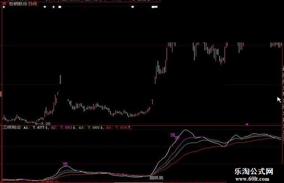 DRAWTEXT(FILTER(A4>REF(A4,2)AND REF(A1,3)<REF(A3,3)AND C>O AND(A10-A9)/A9<0.005,5),A8-0.05,'三线粘合'),COLORRED;