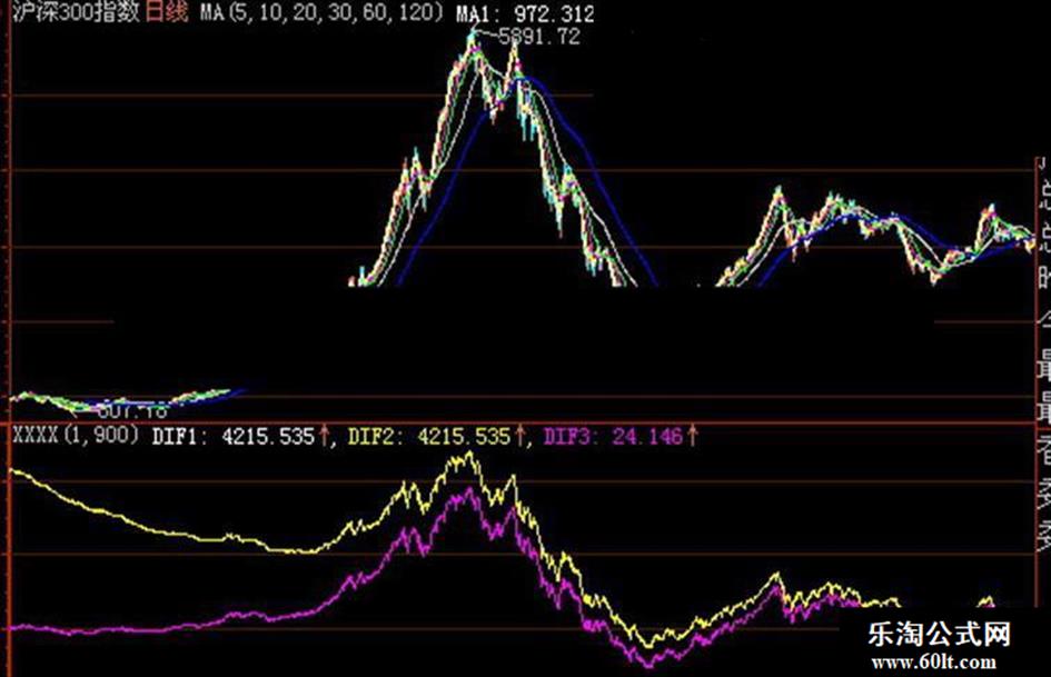 DIF1=DIF2,这个是可以严格证明的。因此图线上看应该不会多于2条线。当SHORT和LONG差别不是太大的话,肉眼只看到1条线,应该是电脑计算精度所限,基本相等。如果两个参数差别很大的话,例如SHORT=1,LONG=900,则DIF1和DIF3两条曲线的差别很大。详见下面图示。