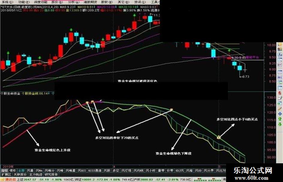 IF(资金生命线<=REF(资金生命线,1),资金生命线,DRAWNULL),COLORGREEN,LINETHICK2;