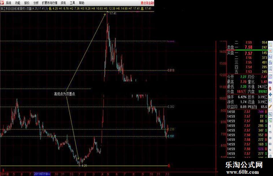 既单基点黄静分割后,模拟通达信画线工具自编了双基点的黄金分割,神奇还是巧合,找股票试一试就知道,均以前一波的高低点为双基点,参数N为低点,参数M为高点。欢迎讨论!