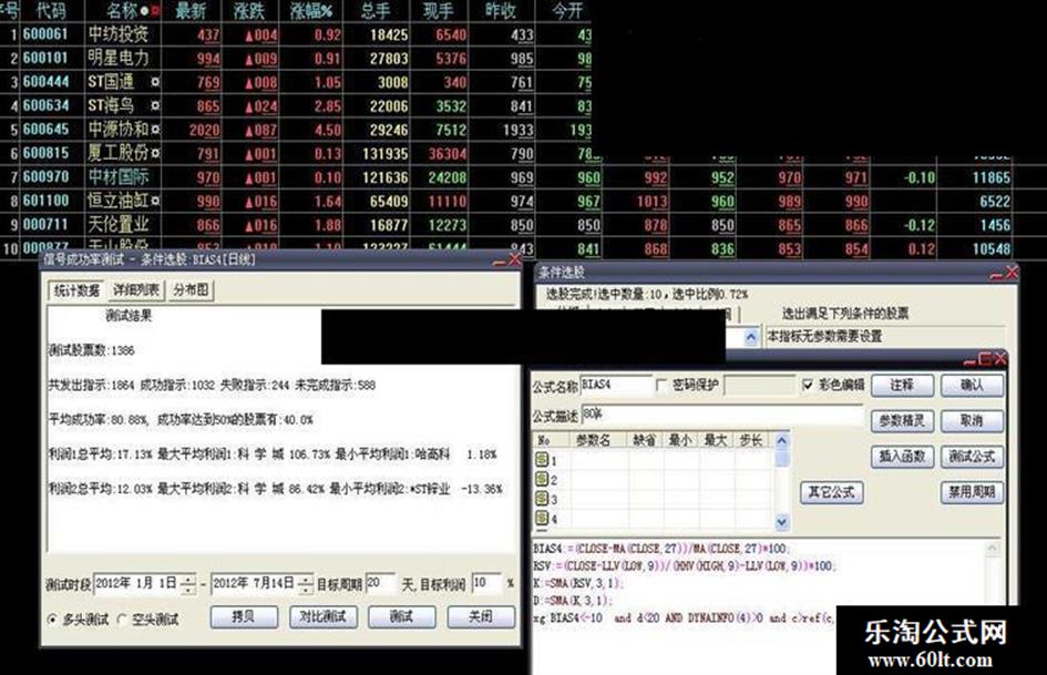 【xg:BIAS4<-10 and d<20 】其中-10和20根据走势可调.目标【1】成功率要大于75%【2】发出指示多于500.【3】选出股票不多于20个.当然选股必须【兼听则明偏信则暗】看看K线其他指标如何才能最后确定你要买入的股票那叫【百里挑一】吗.买入时还要分批次.还要看大盘.还要看分时高低.当然是越便宜愈好.---------不用啰嗦谁也不会和钱较劲的.不是吗. 图上1386是深沪A股股票数.不包括200.和300字头