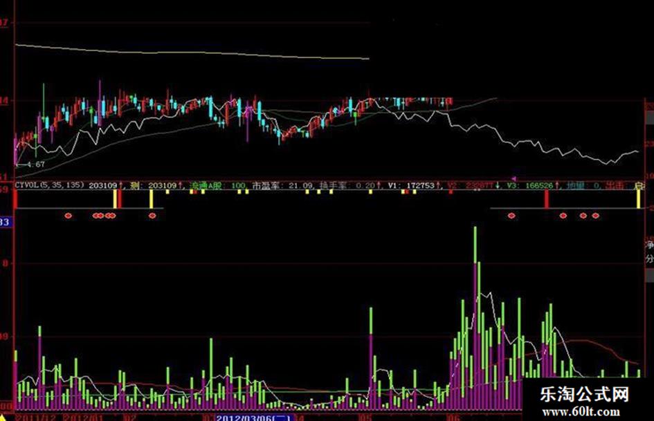 启动:STICKLINE(V1>REF(V1,1) AND (CROSS(VOL,V1) AND (REF(VOL,1)<REF(V3,1) OR REF(VOL,2)<REF(V3,2))),HHvol*1.1,HHVOL*1.2,8,0),COLORYELLOW;