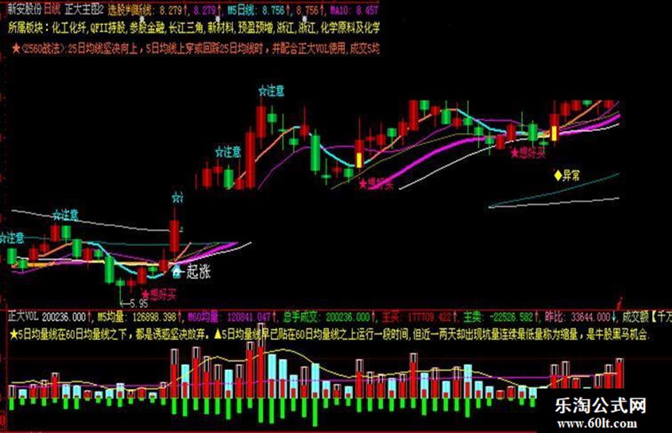 这原公式是前几年不知那位老师的作品,觉得很好用 (在此表现感谢),为了配合《2560战法》--大智慧主图的完整组合,名称暂起正大VOL,我将部分源码做了添加修改,并增加了5日均量线和60日均量线,使指标更加完善实用,本指标无加密,可以任意修改