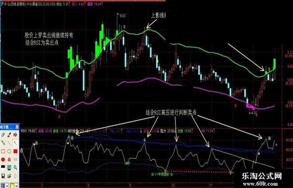 2、股价上穿卖出线继续持有,结合RSI作为判断第一卖出点,当股价回落卖出线时为第二卖出点。