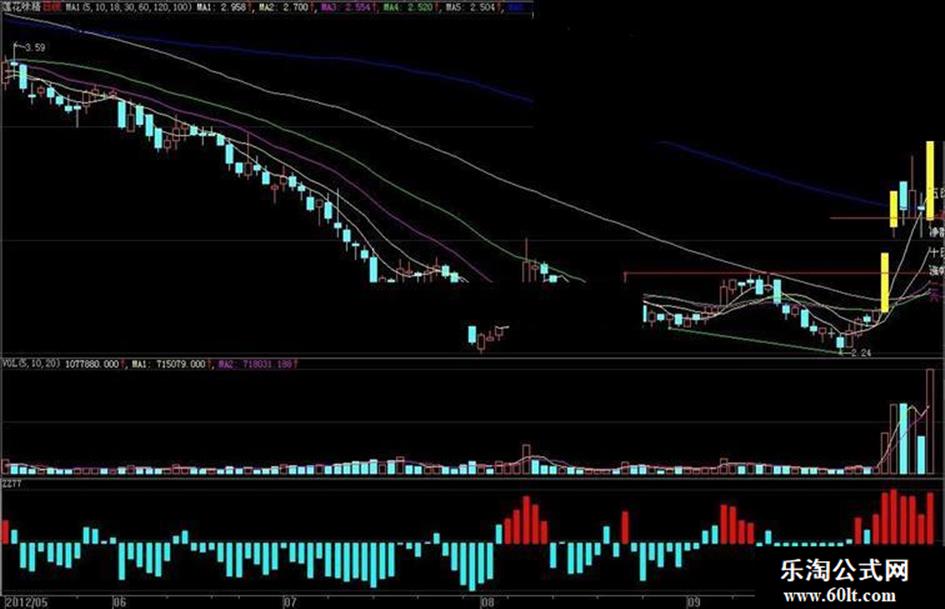 2、说明:公式的设计非常简单,就是利用5日线的角度来衡量资金的进出,红色,资金流入,篮色在下,资金流出。