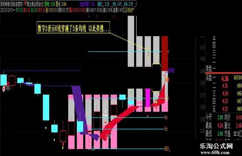 带牡丹红柱体的K线表示K线实体(开盘和收盘)穿越三根或三根以上均线 上方数字表示K线穿越均线根数 数字3表示K线穿越了3条均线 以此类推...