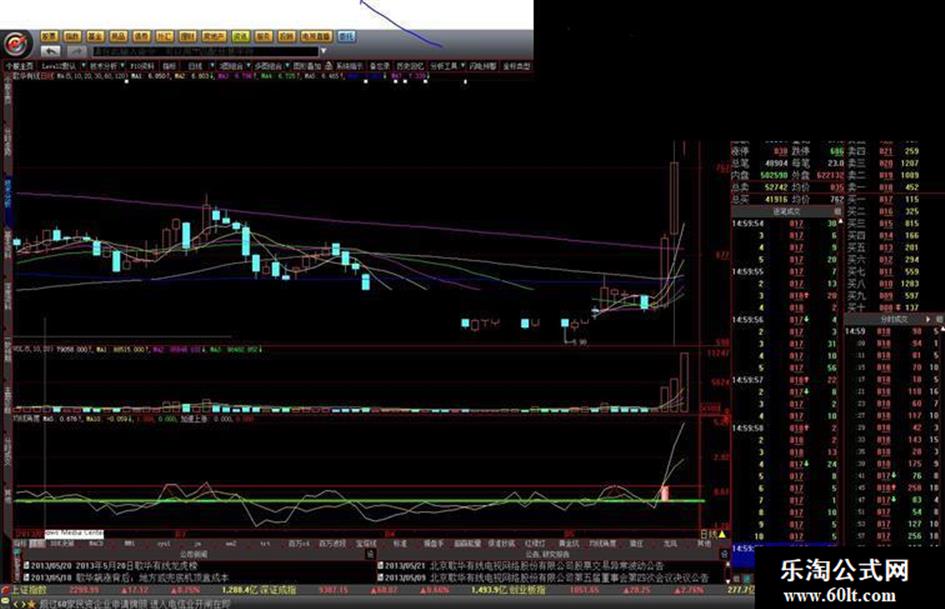 白黄两线下穿红线表示上涨减速,下穿绿线表示下跌开始。