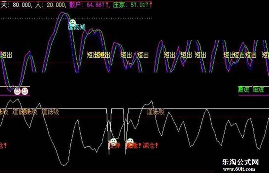 DRAWTEXT(CROSS(庄家,散户) AND 散户>70,75,'逢高减'),COLORFFFF33;