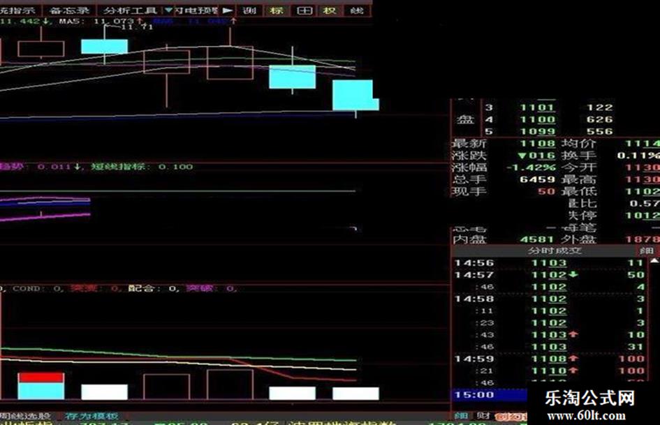短线指标:IF(((((CROSS(短线趋势,中线趋势) AND (短线趋势 < 0)) AND (中线趋势 < (0 - 0.2))) AND (VAR11 > 45)) AND (VAR16 > 0)),0.3,0.1),COLOR66FF00;