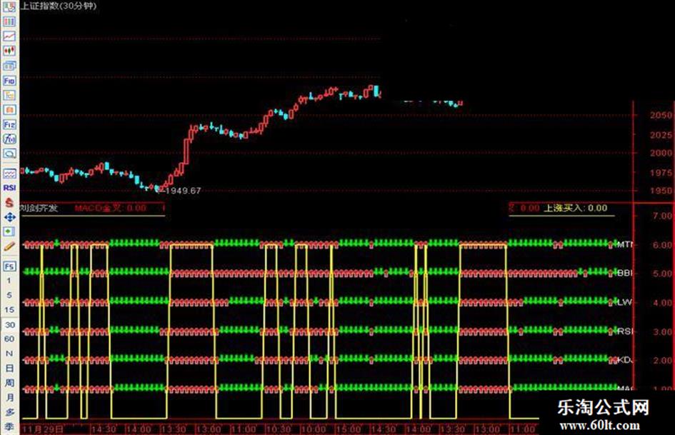 上涨买入:IF(A1 AND A2 AND A3 AND A4 AND A5 AND A6,6,0),COLORYELLOW,LINETHICK2;