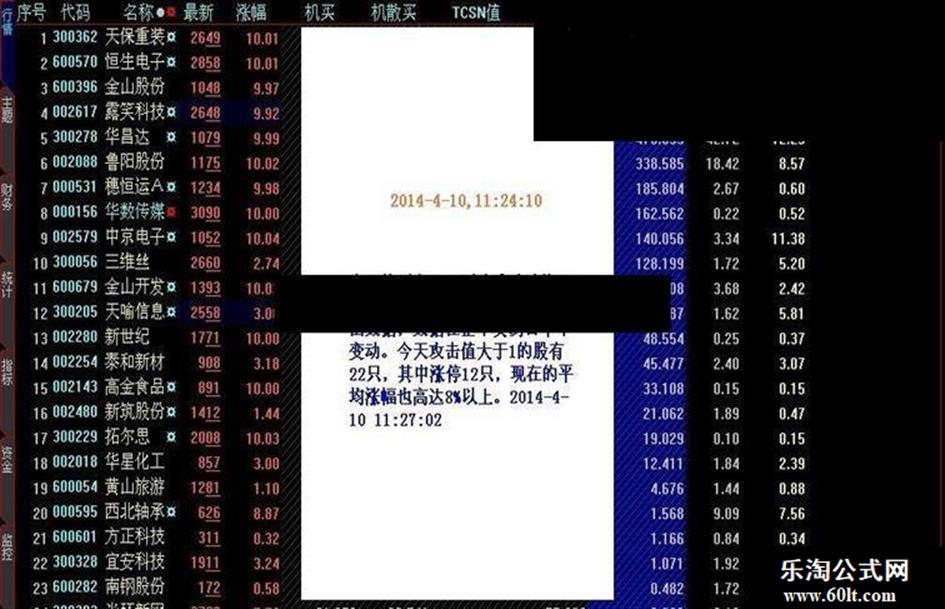 本指标在开盘后就能够显示全天都为固定值的攻击数据,但要使用到全推的分时数据,使用我提供的全推账号和密码就能够在开盘后查看到竞价攻击力度(系统参数设置中的要把分时竞价显示设置为自动)。该指标所示值为主力在竞价时的攻击力度,很大程度上决定了个股当天的走势。其使用方法为:1. 排序值越往前的表示主力在当天攻击力度意原和强度越大。2. 可用于抓涨停。 3. 攻击力度很大而且在连续拉高多天后一般意味着主力第二天出货。 4. 股价在日线上开始突破时如果发现此指标的攻击力度值很大,则表示该股正式启动,后期上涨潜力巨大