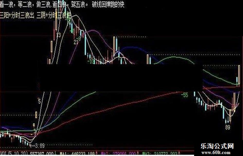 drAWTEXTABS(0,60,'三阳+分时三浪出 三阴+分时三浪进'),LINETHICK1,coloryellow,layer0;