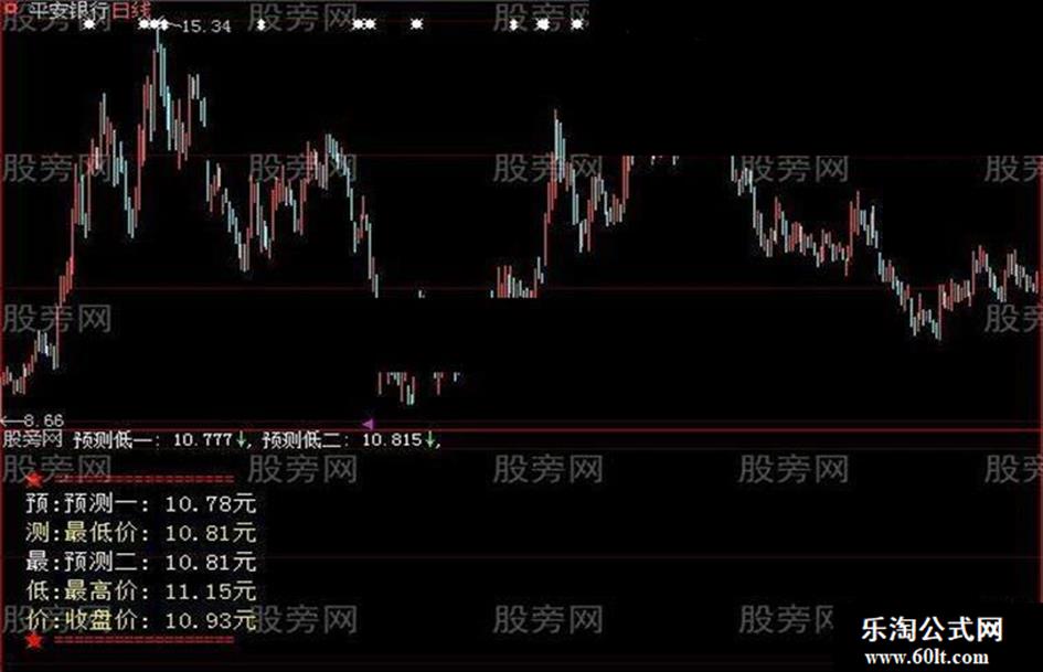 DRAWTEXTABS(15,30,'预:预测一: '+NUMTOSTRN(预测低一,2)+'元'),COLORffFFFF,linethick2;