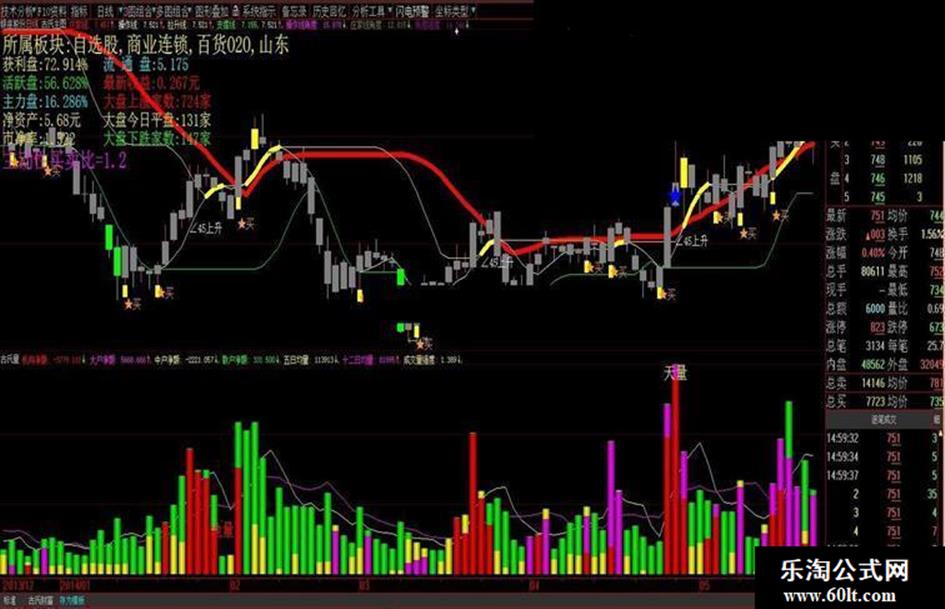 1.在每天的成交量柱上用不同的色柱分类显示机构、大户、中户和散户的净买入量。每天的量柱上最多只会出现三种颜色,因为至少有一家是净卖出的。机构为大红色柱,大户为玖瑰红色柱,中户为黄色柱,散户为绿色柱。