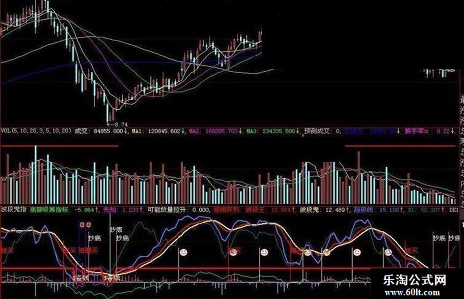 VAR2:=REF(LOW,1); VAR3:=SMA(ABS(LOW-VAR2),3,1)/SMA(MAX(LOW-VAR2,0),3,1)*100; VAR4:=EMA(IF(CLOSE*1.3,VAR3*10,VAR3/10),3); VAR5:=LLV(LOW,30); VAR6:=HHV(VAR4,30); VAR7:=IF(MA(CLOSE,58),1,0); VAR8:=EMA(IF(LOW<=VAR5,(VAR4+VAR6*2)/2,0),3)/618*VAR7; VAR9:=IF(VAR8>100,100,VAR8); STICKLINE(VAR9>-150,0,VAR9,0.3,0), COLORFF00FF; 底部吸筹指标:(CLOSE-MA(CLOSE,40))/MA(CLOSE,40)*100,COLOR00FF00; STICKLINE(CROSS(底部吸筹指标,-24),100,0,1,0), COLORFFFFFF; 先知: (CLOSE-MA(CLOSE,5))/MA(CLOSE,5)*100, COLORFF00FF; 可能放量拉升:IF(CROSS(底部吸筹指标,-24),1,0), COLORFFFFFF; 短线获利:STICKLINE(REF("KDJ.J",1)<0 AND "KDJ.J">0,60,0,2,0),COLOR0000FF; VARK1:=(CLOSE-LLV(LOW,27))/(HHV(HIGH,27)-LLV(LOW,27))*100; VARK2:=REVERSE(VARK1); VARK3:=SMA(VARK1,3,1); 波段王:SMA(VARK3,3,1), COLORRED,LINETHICK2; 波段鬼:SMA(波段王,2.5,1),COLORYELLOW,LINETHICK2; 趋势线: 3*SMA((CLOSE-LLV(LOW,27))/(HHV(HIGH,27)-LLV(LOW,27))*100,5,1)-2*SMA(SMA((CLOSE-LLV(LOW,27))/(HHV(HIGH,27)-LLV(LOW,27))*100,5,1),3,1),COLORFF6666,LINETHICK2; RSV9:=(CLOSE-LLV(LOW,9))/(HHV(HIGH,9)-LLV(LOW,9))*100; K1:SMA(RSV9,3,1); DK1:K1-REF(K1,1),COLORSTICK; 出手就赢:IF(DK1>7 AND REF(DK1,1)<0 AND (DK1-REF(DK1,1))>9,50,0), STICK,COLORYELLOW;DRAWICON(出手就赢>0,50 ,1); STICKLINE( CROSS(趋势线,10),0,73,3,0), COLOR3366FF; DRAWTEXT(IF(CROSS(趋势线,10),100,0),68,'抄底'),COLORWHITE ; DRAWTEXT(IF(CROSS(10,趋势线),1,0), 10,'$备钱'),COLOR33FFCC; DRAWTEXT(REF("KDJ.J",1)<0 AND "KDJ.J">0,50,'短买'),COLORRED ; DRAWTEXT(CROSS(底部吸筹指标,-24),80,'抄底'),COLORWHITE ; RSV:=(((CLOSE - LLV(LOW,9)) / (HHV(HIGH,9) - LLV(LOW,9))) * 100); 短期底部:=LLV(OPEN,30); K:=SMA(RSV,3,1); D:=SMA(K,3,1); J:=((3 * K) - (2 * D)); AA10:=MA(CLOSE,10); AA12:=MA(CLOSE,12); BB10:=((ATAN((AA10 - REF(AA10,1))) * 3.1416) * 10); BB12:=((ATAN((AA12 - REF(AA12,1))) * 3.1416) * 10); MA13:=MA(CLOSE,13); VARB:=(((CLOSE - MA(CLOSE,6)) / MA(CLOSE,6)) * 100); VARC:=(((CLOSE - MA(CLOSE,12)) / MA(CLOSE,12)) * 100); VARD:=(((CLOSE - MA(CLOSE,24)) / MA(CLOSE,24)) * 100); VARE:=(((VARB + (2 * VARC)) + (3 * VARD)) / 6); VARF:=MA(VARE,3); STICKLINE((CROSS(J,0) AND (VARF <= (0 - 7))),0,88,2,0),COLORBLUE; DRAWICON((CROSS(J,0) AND (VARF <= (0 - 7))),88,9); VARO2:=(CLOSE-LLV(LOW,26))/(HHV(HIGH,26)-LLV(LOW,26))*100; VARO3:=SMA(SMA(VARO2,3,1),3,1); VARO4:=EMA(VARO3,5); VARO5:=LLV(LOW,26); VARO6:=HHV(HIGH,34); VARO7:=EMA((CLOSE-VARO5)/(VARO6-VARO5)*4,4)*25; STICKLINE(CROSS(VARO4,10) AND VARO4>10,25,0,1,0),COLORYELLOW; 建仓区: IF((VARO7<10),0,20),LINETHICK3 ,COLORred;