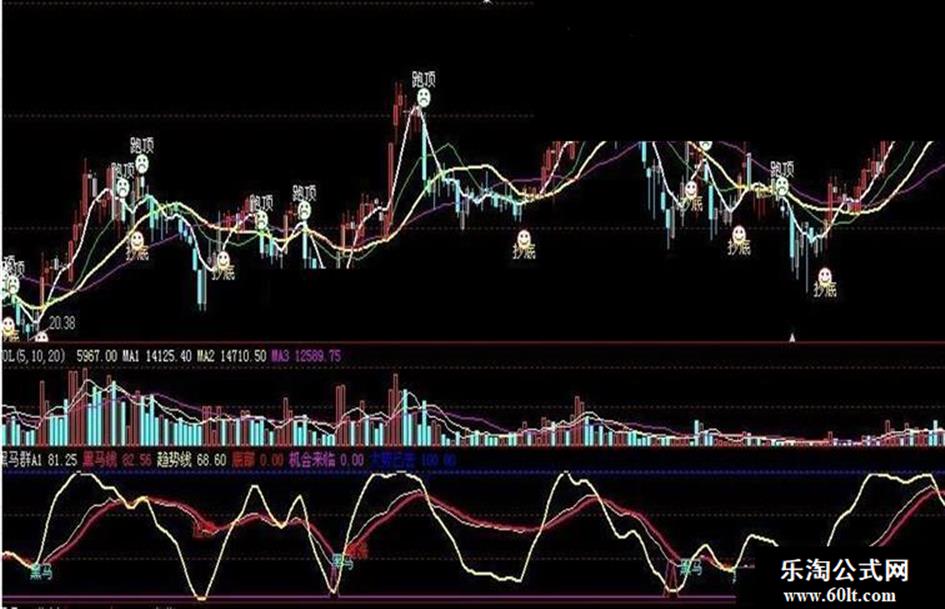 DRAWTEXT(CROSS(黑马线,A5)AND 趋势线<80,黑马线,'追涨');